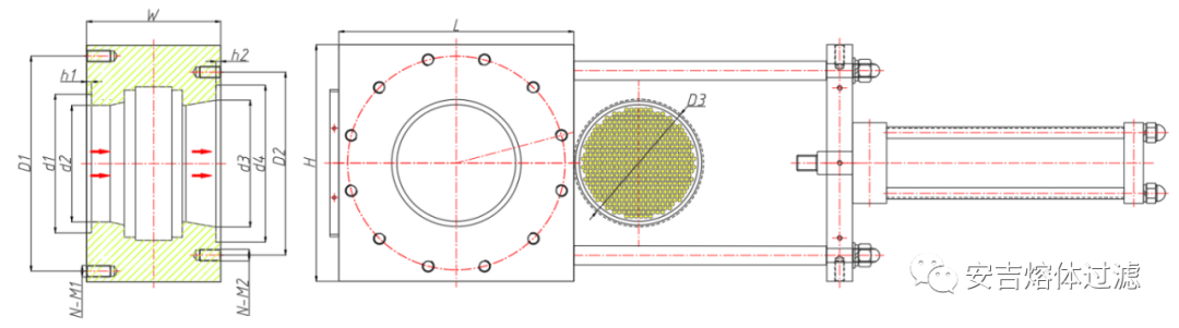 單板雙工位液壓換網器是由換網器機體、滑板、液壓缸、保溫板等基本部件組成。在換網器滑板上開有2個過濾通道,內鑲裝過濾多孔板(過濾網板),2個多孔板在液壓系統的作用下,可交替進入工作位及換網位。