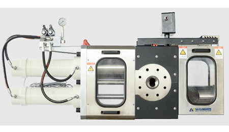 單板雙工位液壓換網器,不停機換網,流道短,停留時間短。